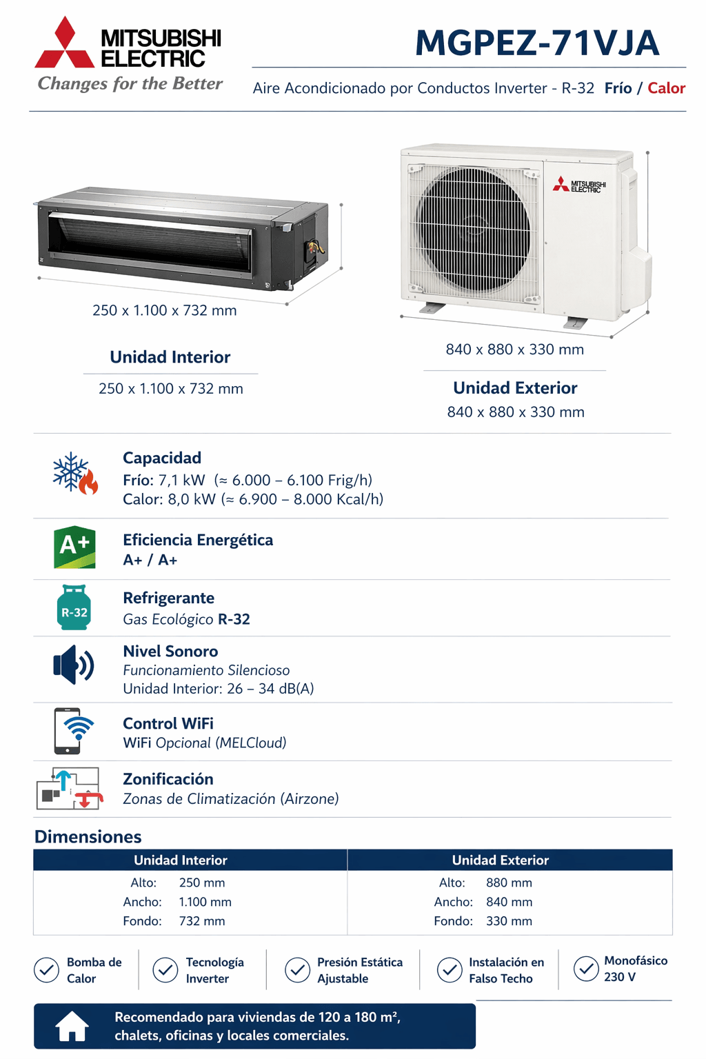 El Mitsubishi Electric MGPEZ-71VJA es un sistema de climatización por conductos de alta gama, diseñado para ofrecer máximo confort, eficiencia energética y total discreción.