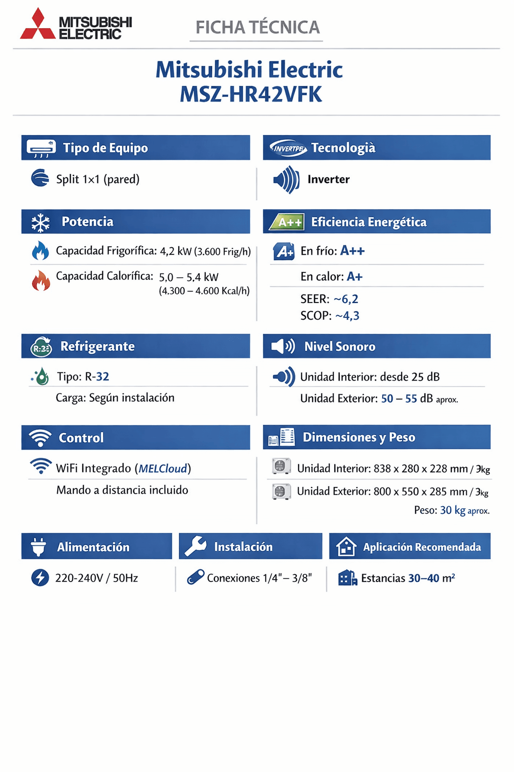 El MSZ-HR42VFK es la elección ideal para quienes buscan un equipo con mayor potencia, buena eficiencia y fiabilidad contrastada, especialmente en viviendas con aislamiento medio o uso intensivo en verano.